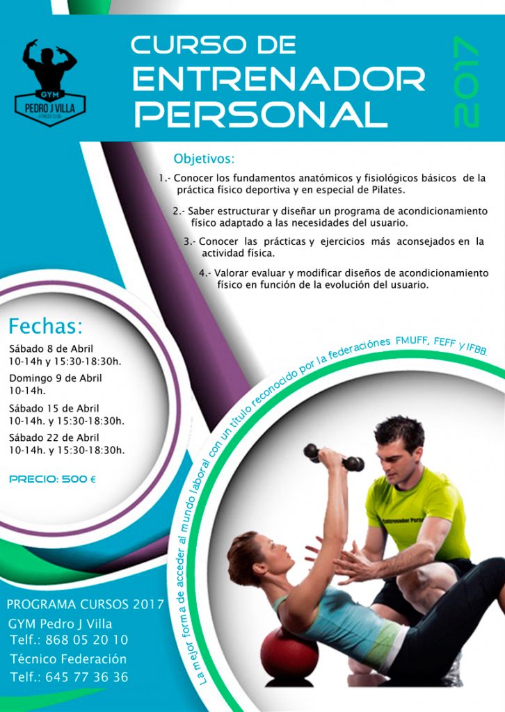 A partir del sábado 8 de abril en el gimnasio Pedro J. Villa se celebrará el curso de Entrenador Personal de la Federación Española de Fisicoculturismo que convoca la territorial murciana. Más información en el teléfono 868 05 20 10.