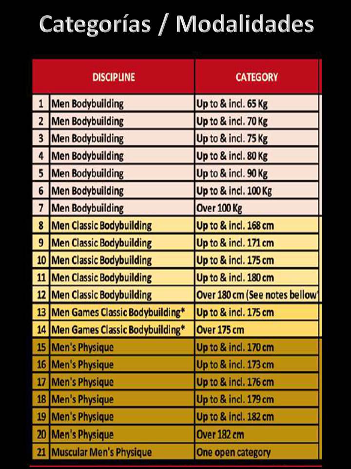 Como novedad este año, estan incluidas todas las categorias masculinas en Men´s Physique, sin duda un aliciente excepcional  para todos los atletas de  esta modalidad que tanto esplendor esta alcanzando en cada evento Internacional.