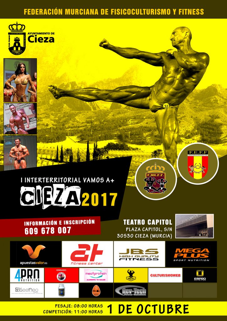 En el impresionante Teatro Capitol de Cieza con pesaje a las 8h y Competición a partir de las 11h del Domingo 01 de Octubre. Como acostumbra la organización de estos certámenes A+, aseguran la máxima atención a competidores y coach con detalles para todos y premios para los mejores de todas las categorías.